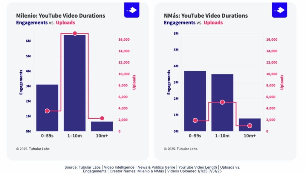 NMás posted 2.8× more mid-length videos, yet earned nearly half of their engagements from Shorts.