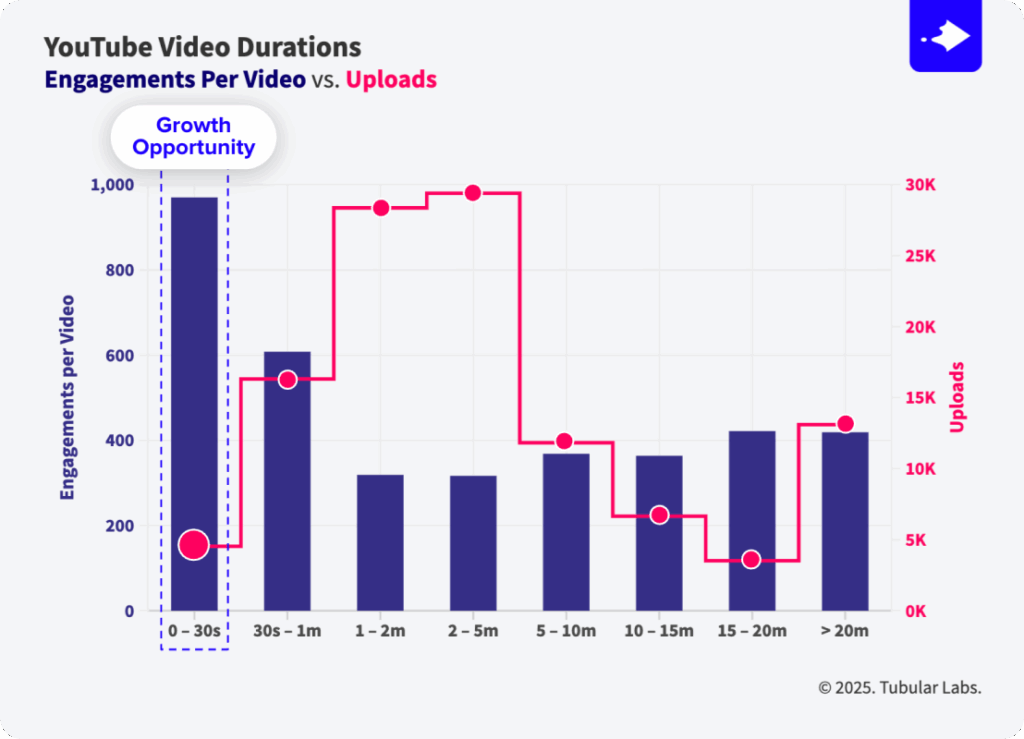 YouTube videos under 30 seconds deliver the highest engagement per video for News, Government & Politics videos. Meanwhile, most uploads are videos between 1-5 minutes, which actually delivers the lowest engagements per video.