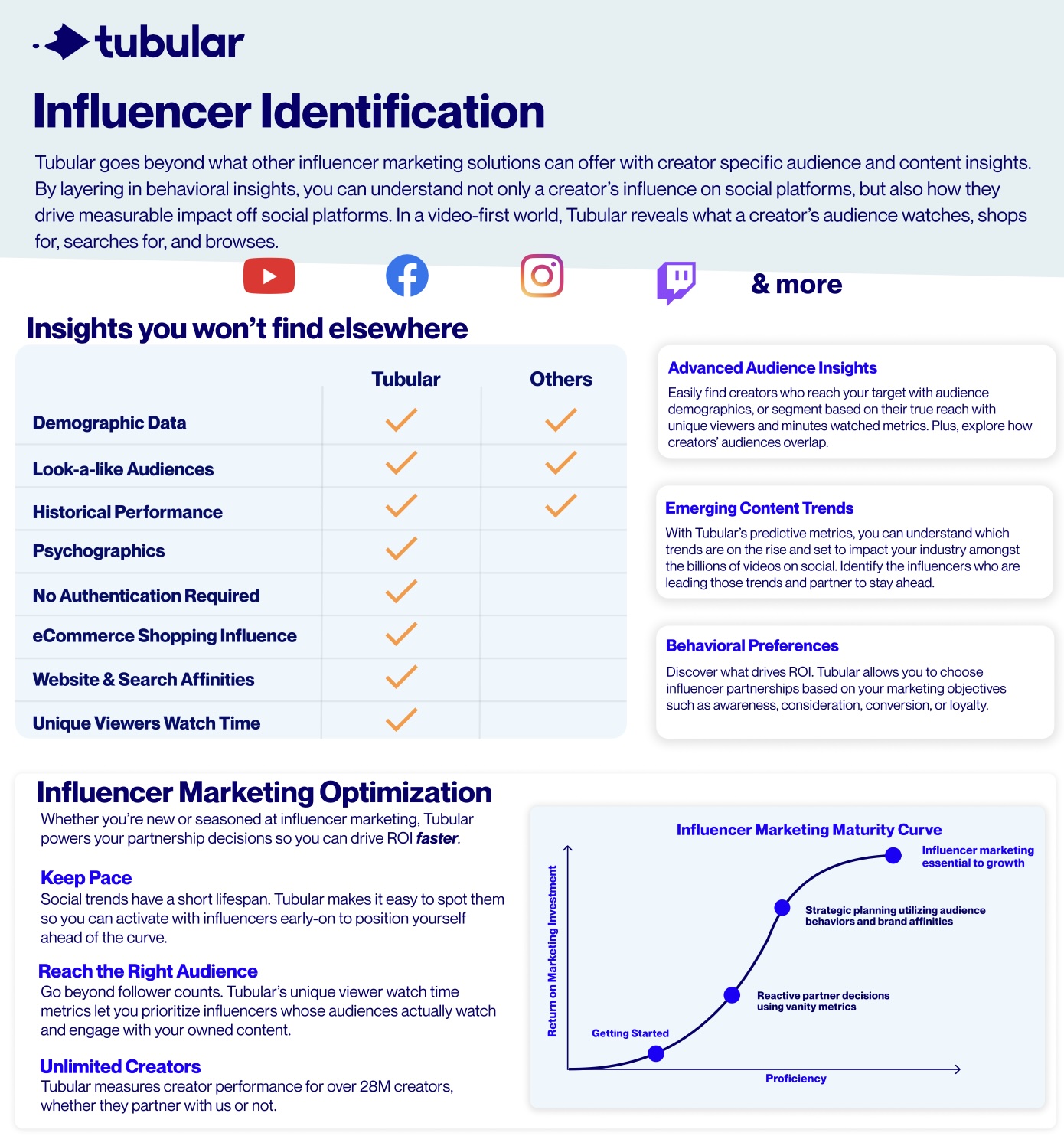 Review virtually any influencer. Want to find the next rising star? It helps to look at the full universe. Some solutions limit you to their network of creators, but Tubular measures audience and content performance for the most creators across YouTube, Facebook, Instagram, Twitch, and more.